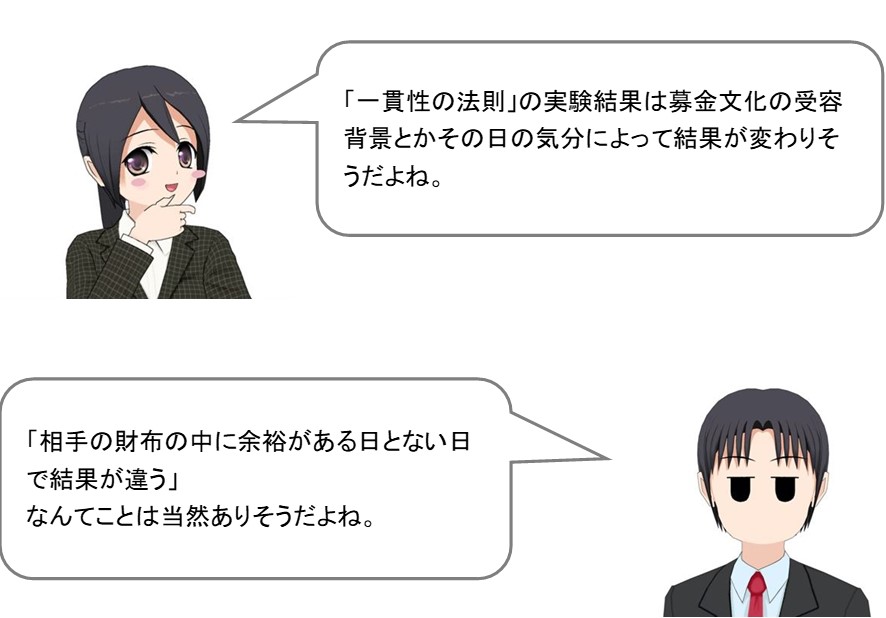 そこに「実は、今日一日の募金目標にあと50,000円足りません。アフリカの子供たちを助けるためにもう少しだけどうにかいただけませんでしょうか?」と言われてしまうと多くの人が先に払った500円にプラスして500円以上のお金を追加で払ってしまう、というような現象を示すと言われている。